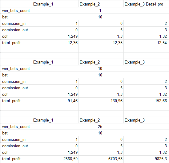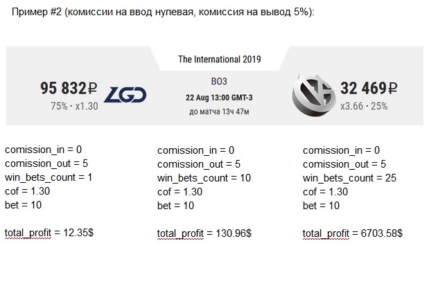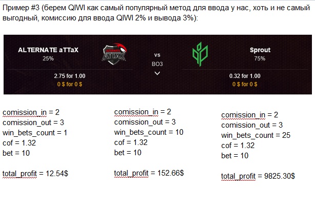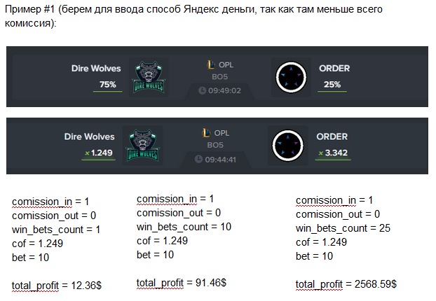 Также, для наглядности, мы решили подсчитать для вас доход при условии ввода 10 долларов и совершении разного количества ставок постоянно ставя депозит плюс профит с предыдущих ставок (извините, что команды разные - мы искали одинаковый процент на победу команд для чистоты эксперимента). Примеры вы можете увидеть в приложенных иллюстрациях.