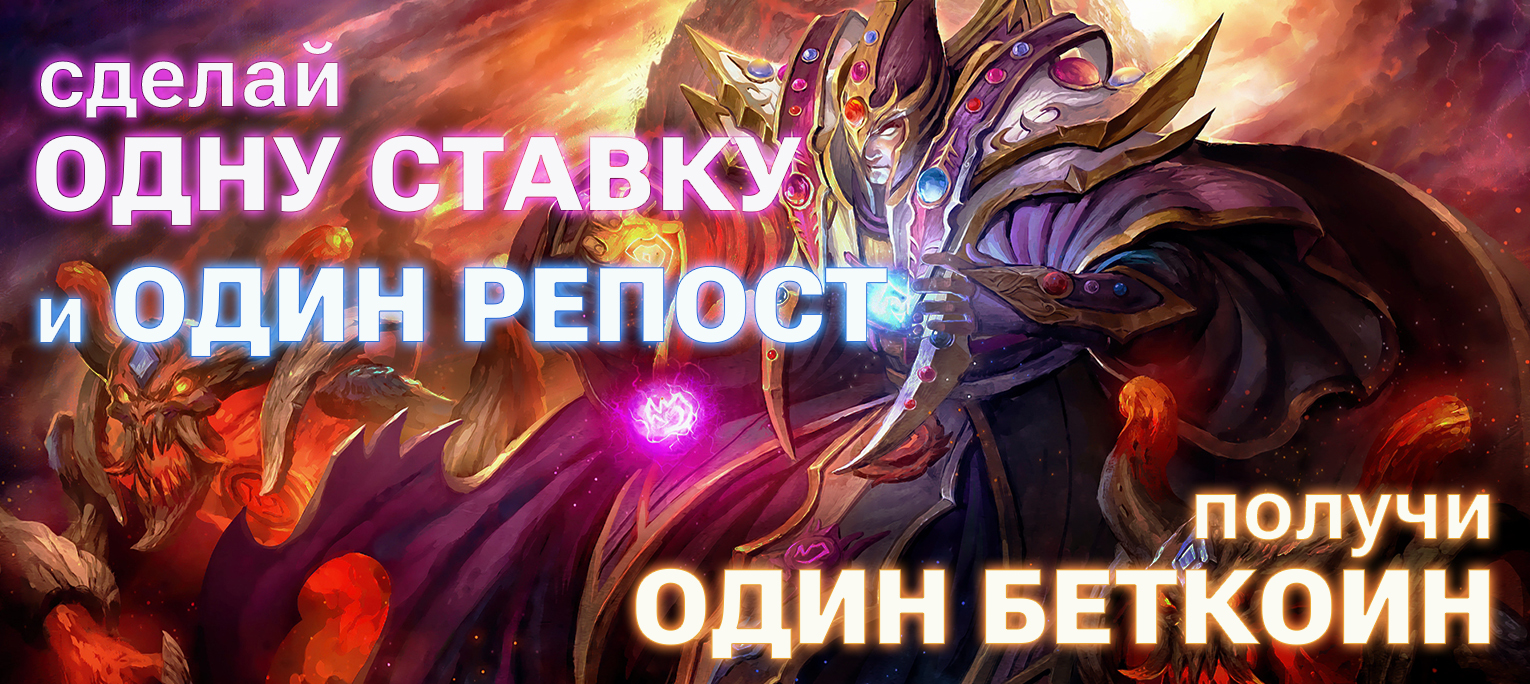 Сделайте ставку на любые событие ивента The International 2022 и репост поста с акцией в ВК до начала основной стадии турнира (14 октября 2022 включительно) и получите 1 Беткоин на счет.